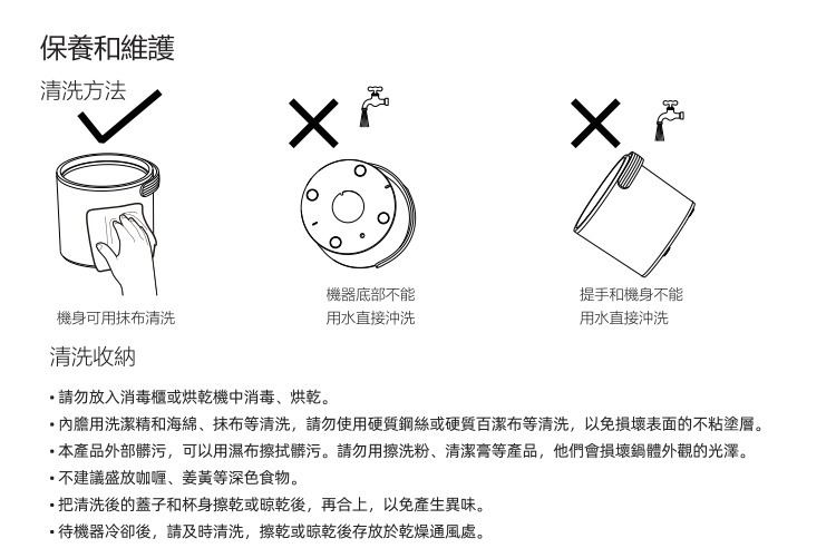 不能讓煲底入水。機身表面亦不能直接沖洗。